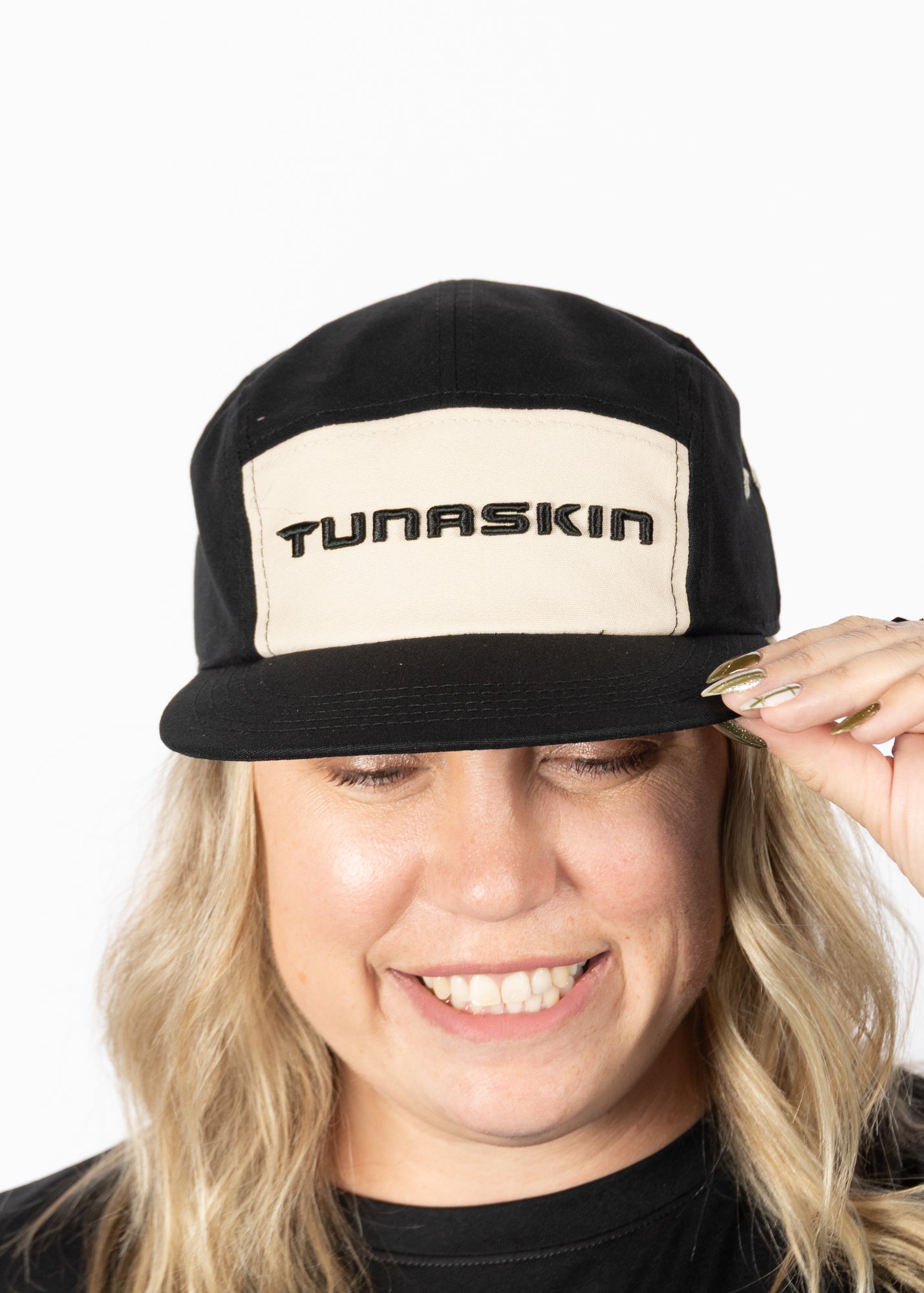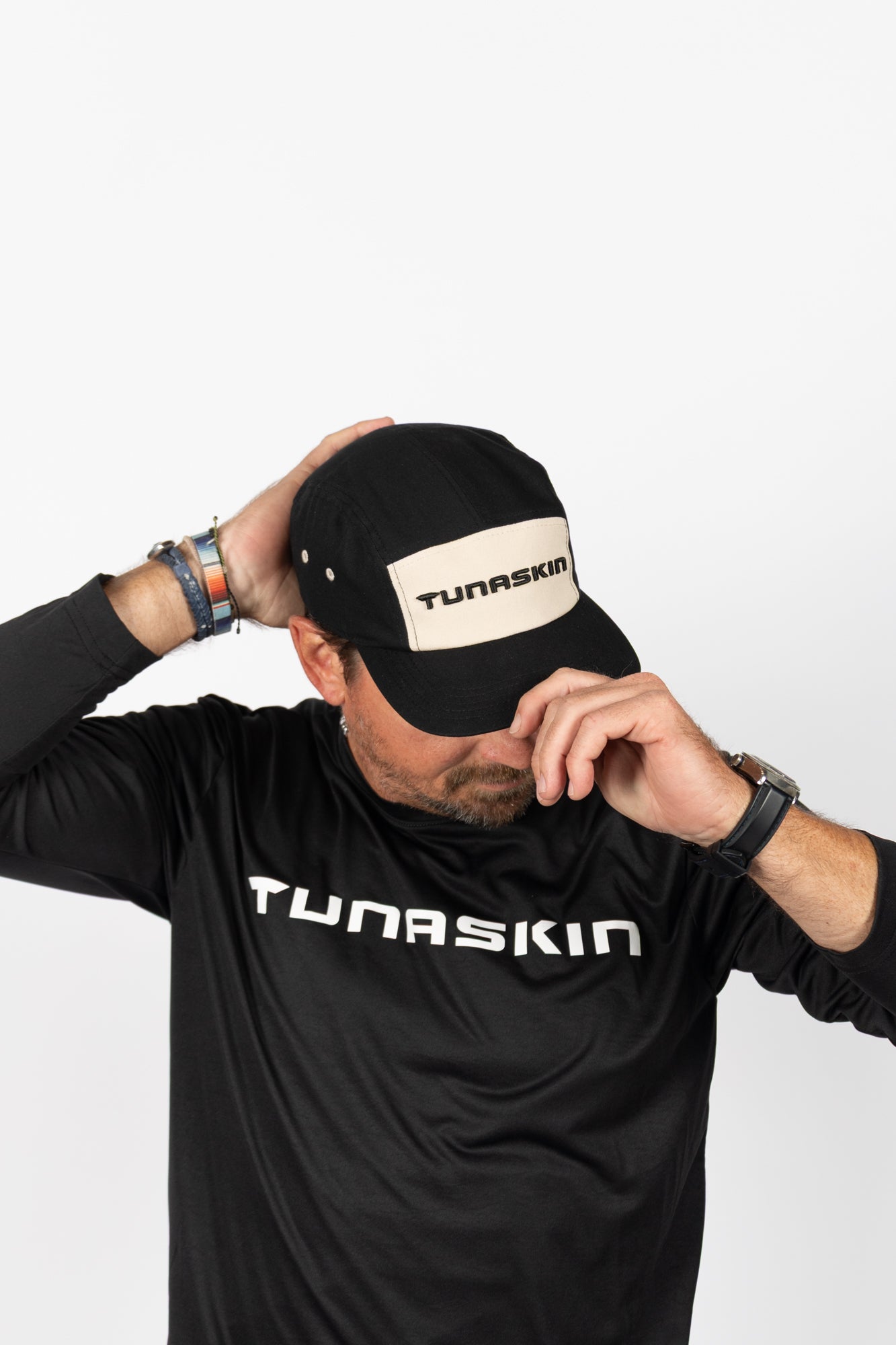 Featuring a contrasting front panel with the Tunaskin logo in raised embroidery, an organic canvas build, and a cotton twill sweatband, this hat blends functionality with everyday style. The adjustable black plastic buckle ensures a secure fit for all-day wear.