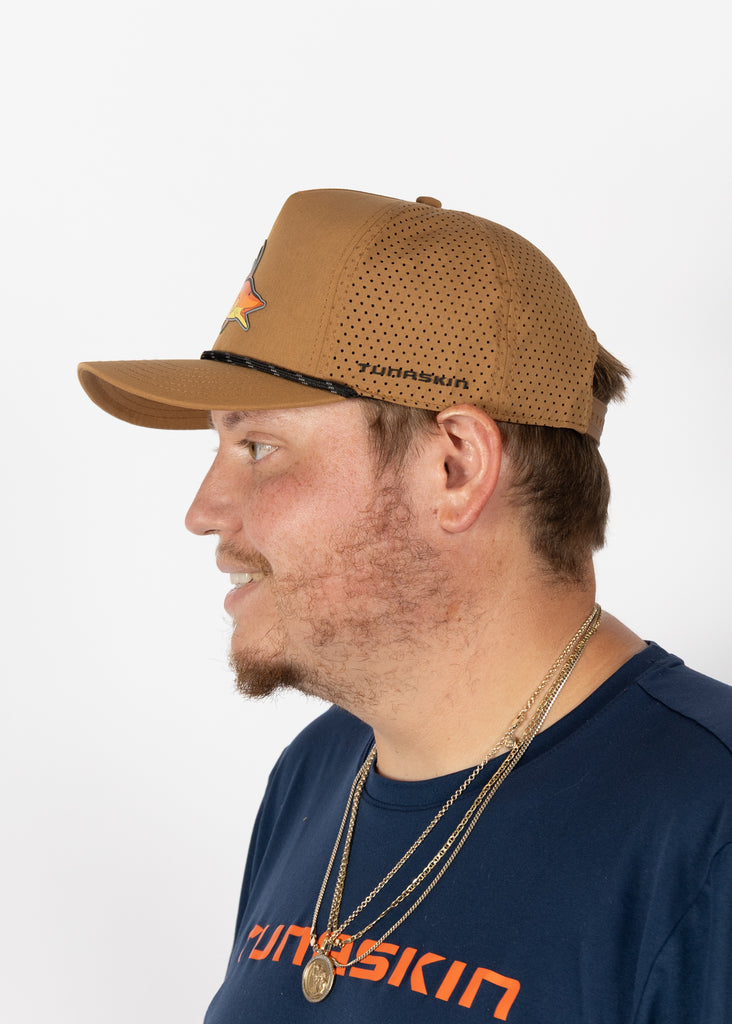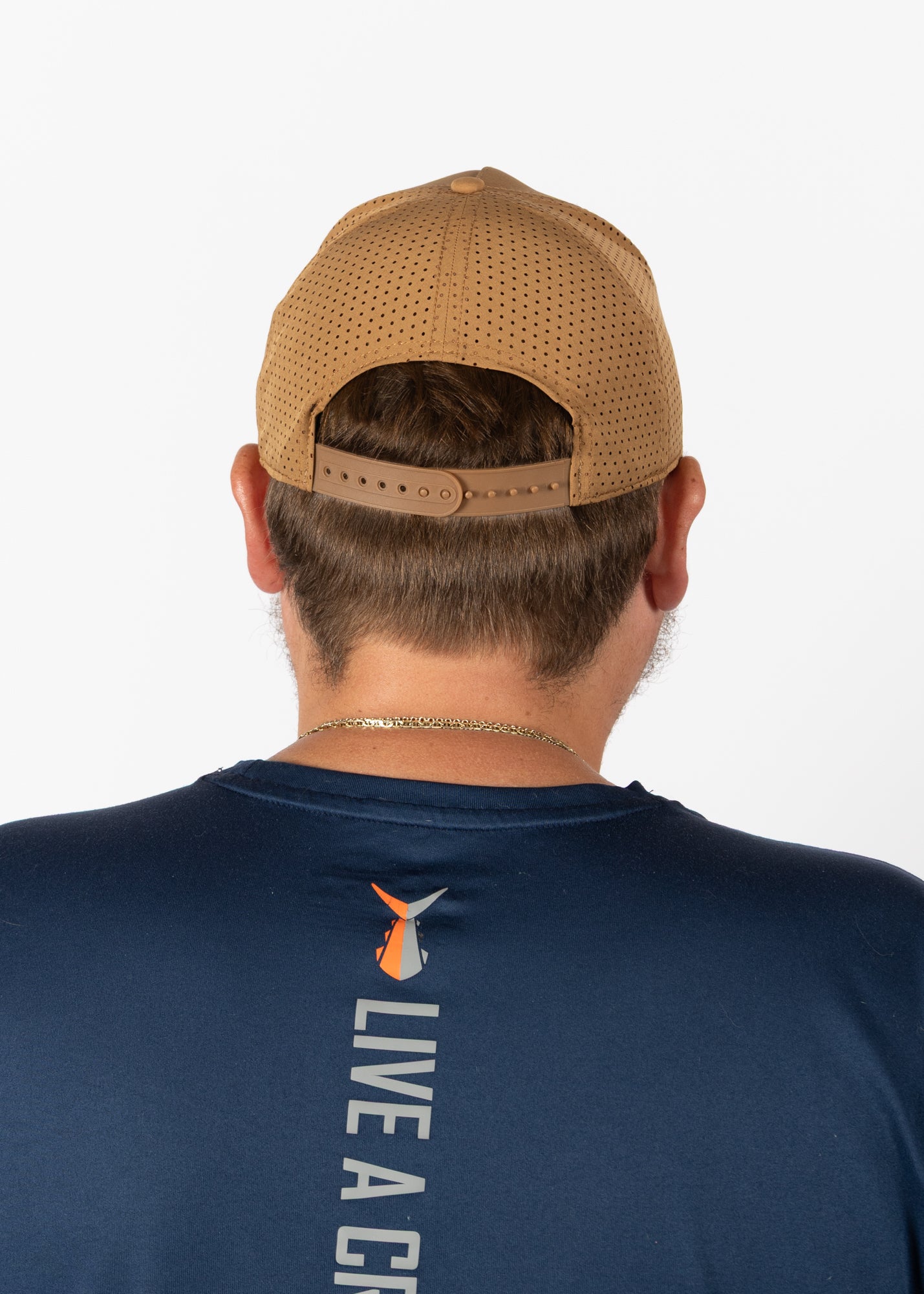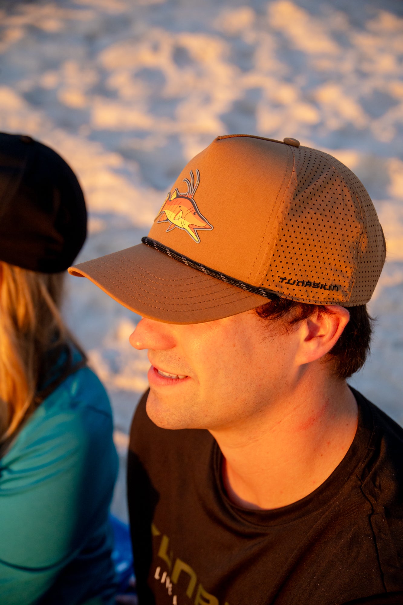 The Tunaskin Hogfish Hat brings coastal style and performance together. Designed with a mid-crown, structured fit, this 5-panel hat features breathable tech fabric with perforated back panels to keep you cool on sunny days.